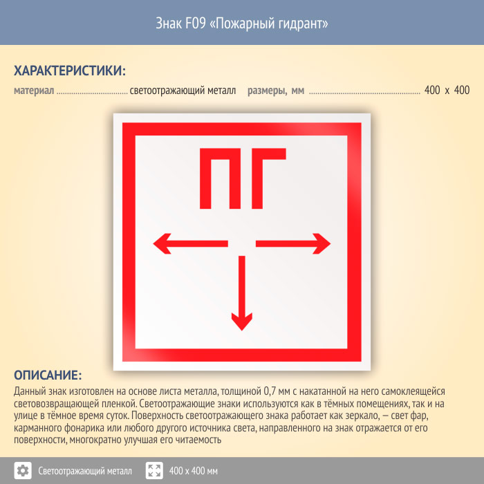Знак F09 «Пожарный гидрант» (светоотражающий металл, 400х400 мм) в Ожерелье купить